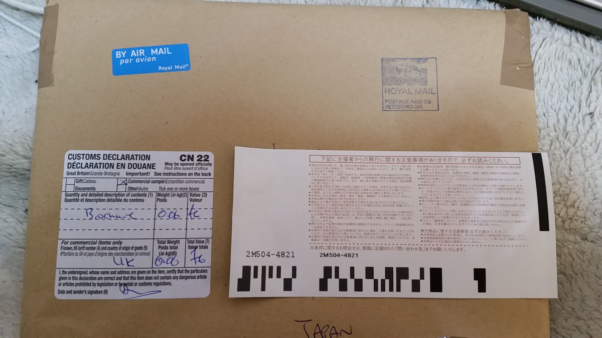 イギリスからのエアメールでございます。イギリスに知り合いなんていないし、商品名に「Brochure」と書かれている時点で確定ですね。